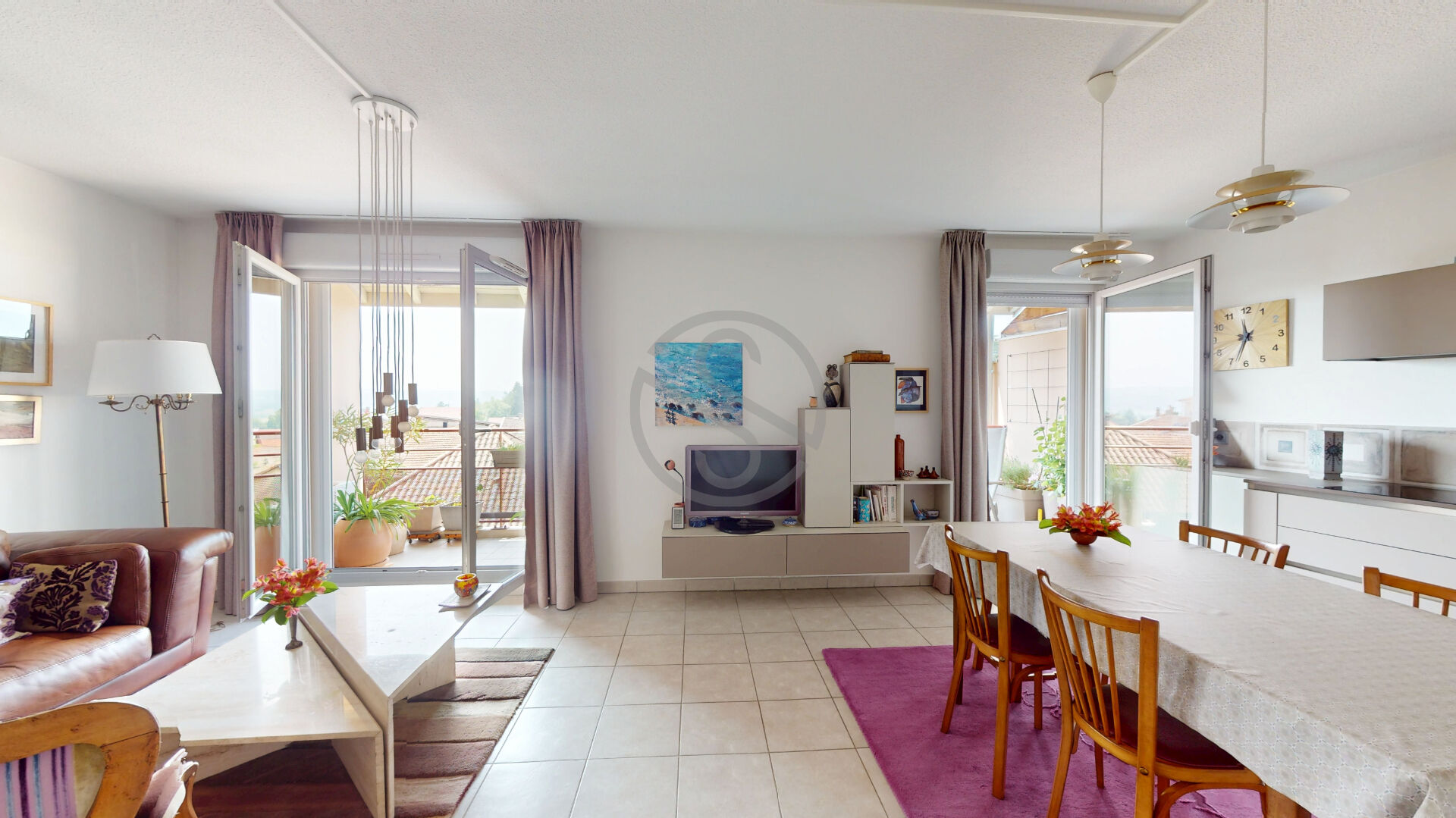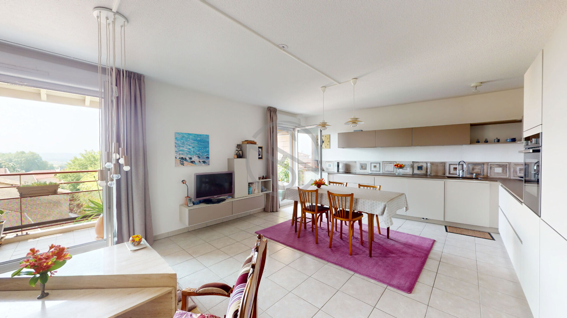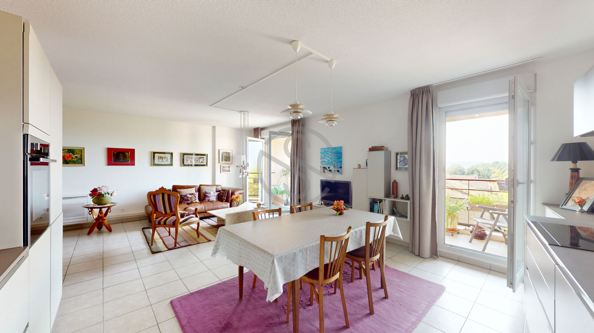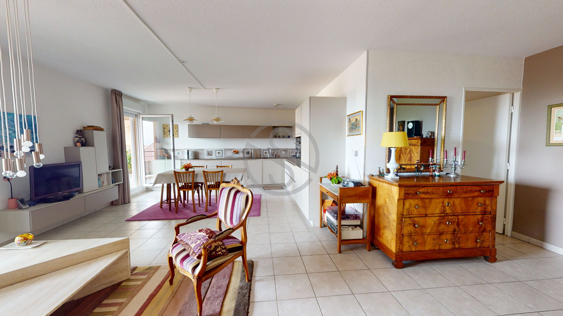 Composé d’un hall d’entrée avec placard, une pièce de vie spacieuse et lumineuse de 40m2 donnant plein SUD avec une vue dégagée.