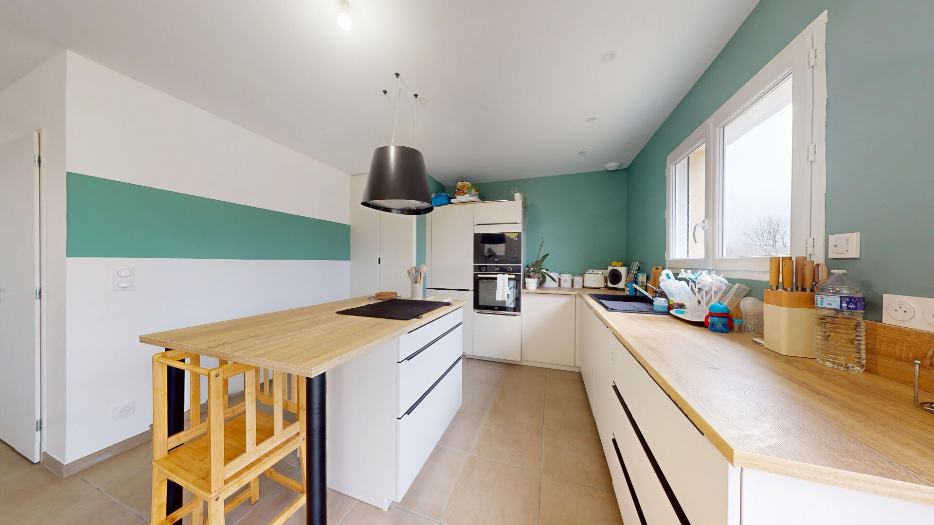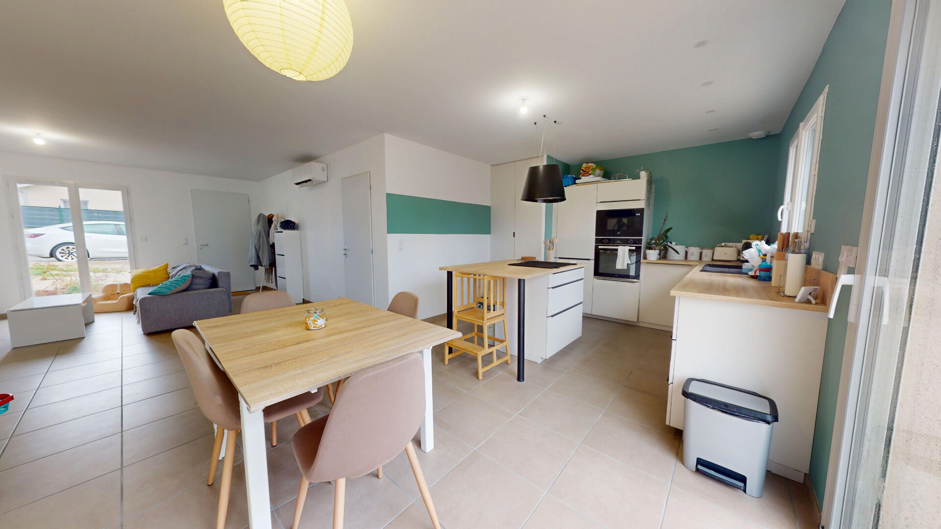 Elle se compose d’une belle pièce de vie ouverte sur une cuisine moderne et fonctionnelle.