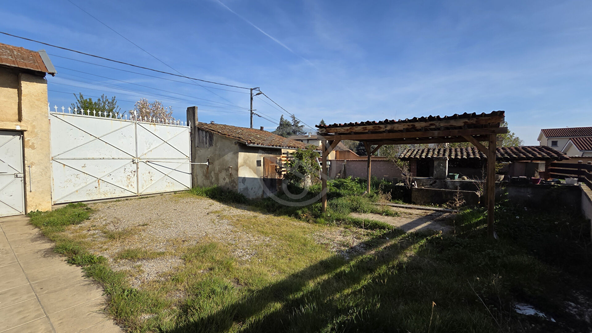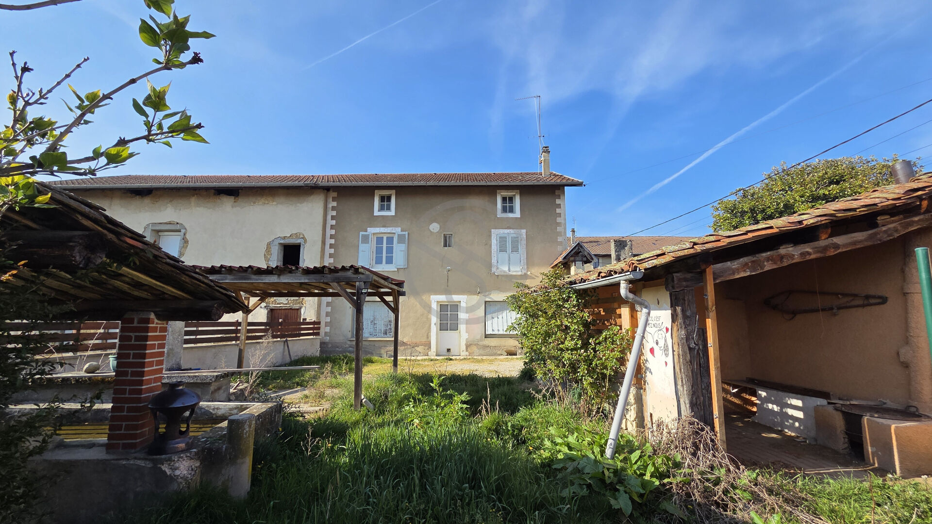 La cour est entièrement close et permet le stationnement de 2 véhicules en plus de son haut vent couvert, de son petit atelier et d’un bassin ancien.